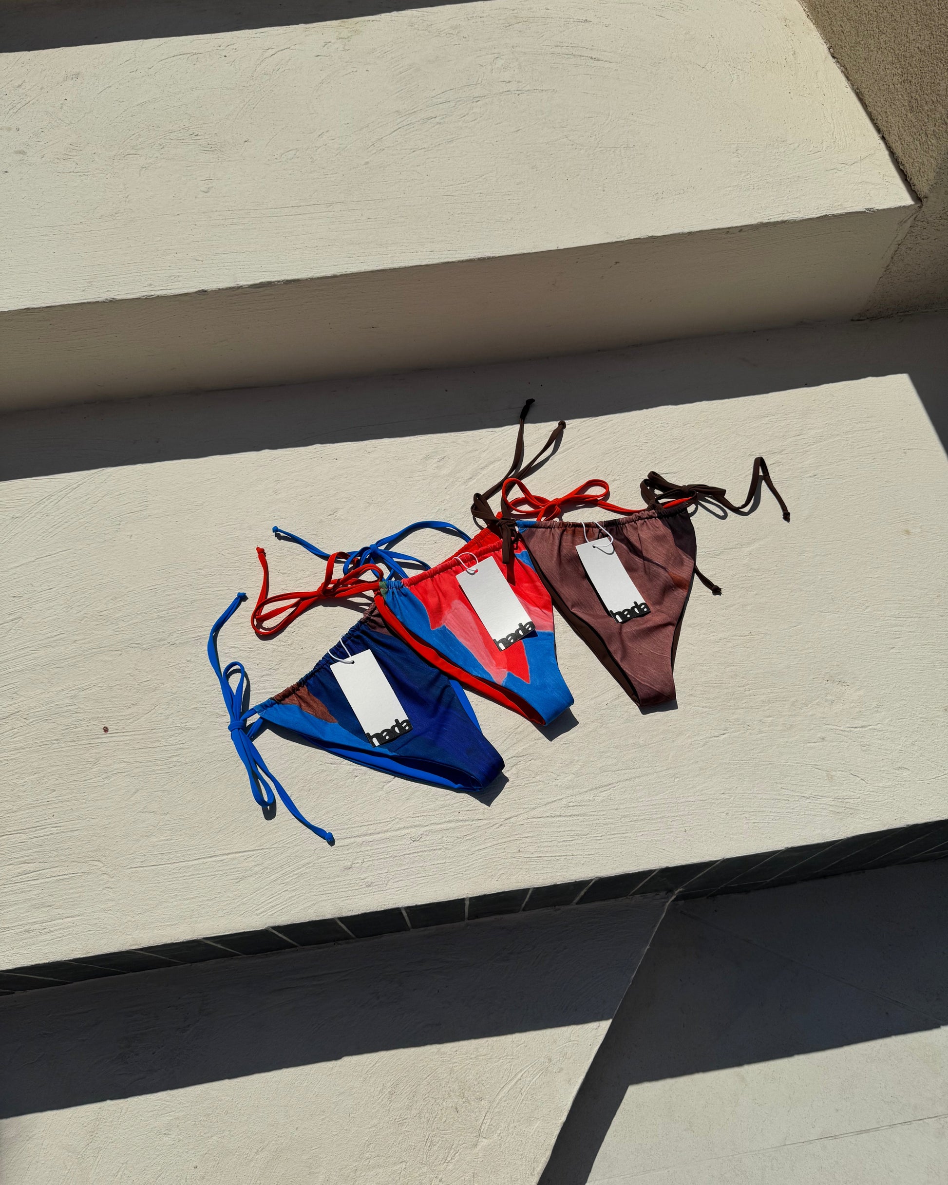 Bas de bikini réversible, offrant deux looks en un : un côté uni sobre orange et un côté imprimé tiré d’une peinture originale réalisée par Inès Hadjhacène.